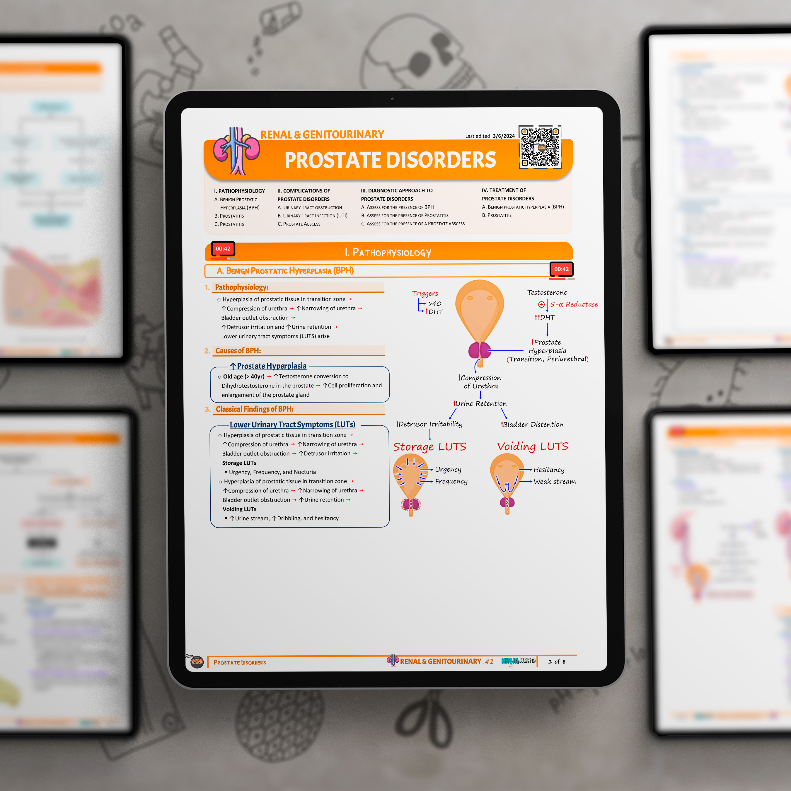 In this lecture, Professor Zach Murphy will present on Prostate Disorders. We will discuss the pathophysiology, focusing on common conditions affecting the prostate such as benign prostatic hyperplasia (BPH), prostatitis, and prostate cancer. The lecture will include a discussion on the clinical manifestations, including urinary frequency, nocturia, difficulty starting urination, and potential pain in cases of prostatitis. The digital presentation will begin with the diagnostic approach, highlighting the importance of digital rectal examinations, prostate-specific antigen (PSA) testing, and imaging studies such as ultrasound. Finally, we will review management strategies for Prostate Disorders, emphasizing lifestyle changes and medications for BPH, antibiotics for prostatitis, and various treatment options for prostate cancer, including surgery, radiation therapy, and hormone therapy. Enjoy the lecture and support us below!