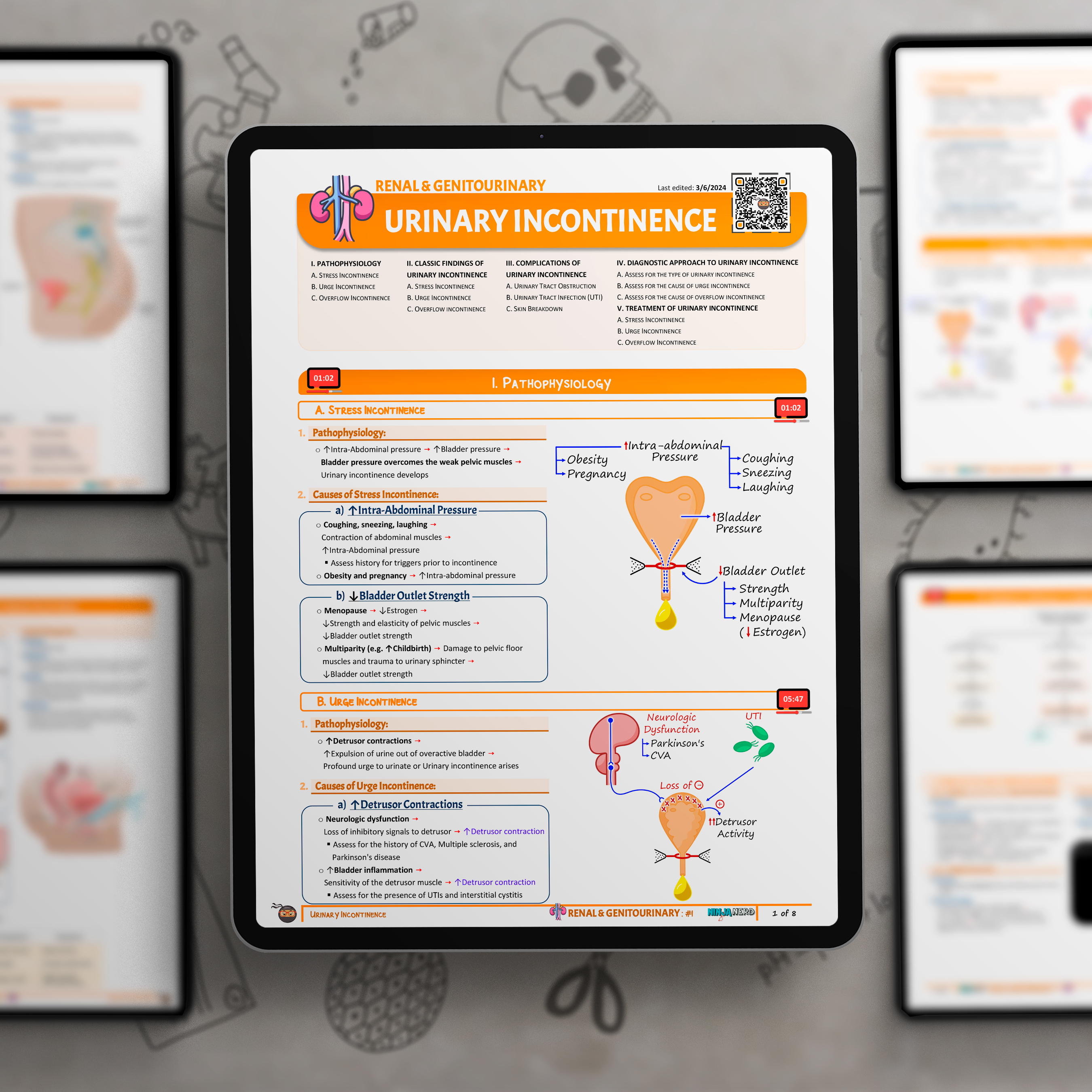 In this lecture, Professor Zach Murphy will present on Urinary Incontinence. We will discuss the pathophysiology, focusing on the involuntary leakage of urine, which can be due to various factors including stress incontinence, urge incontinence, overflow incontinence, and functional incontinence. The lecture will include a discussion on the clinical manifestations, highlighting how each type of incontinence affects individuals differently, from leaking urine when coughing or sneezing to feeling a sudden, intense urge to urinate. The digital presentation will begin with the diagnostic approach, emphasizing the importance of patient history, physical examination, bladder diaries, and urodynamic testing. Finally, we will review management strategies for Urinary Incontinence, including pelvic floor muscle exercises, behavioral modifications, medications, and in some cases, surgical interventions. Enjoy the lecture and support us below!